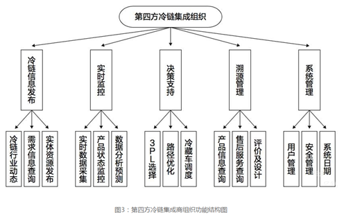基于平臺經(jīng)濟(jì)的第四方冷鏈集成商組織功能結(jié)構(gòu)如圖3所示,主要功能分為冷鏈信息發(fā)布、產(chǎn)品實時監(jiān)控、決策支持、溯源管理及系統(tǒng)管理五大板塊。